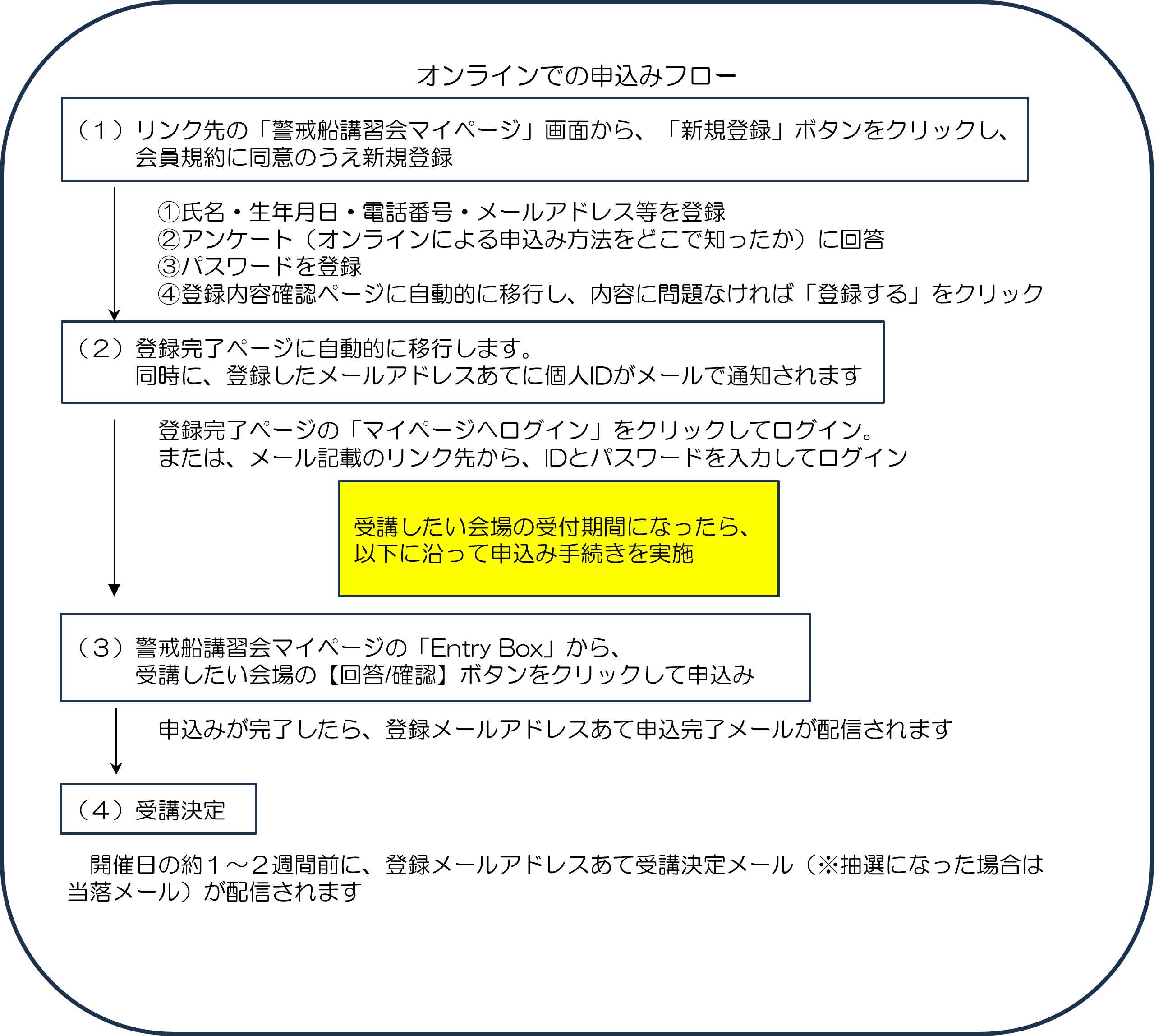 今年度は、郵送での申込みに加えて、オンラインでの申込みが可能となりました。詳細な開催案内及び警戒船講習会受講申請書(郵送での申込みに必要となります)につきましては、申込受付期間の約2週間前までに当ホームページに掲載いたします。
