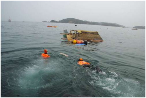 宮城県石巻市雄勝湾で漂流家屋の潜水調査を行う潜水士