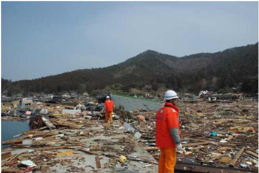 宮城県石巻市立浜漁港での被害状況調査及び行方不明者捜索を行う海上保安官