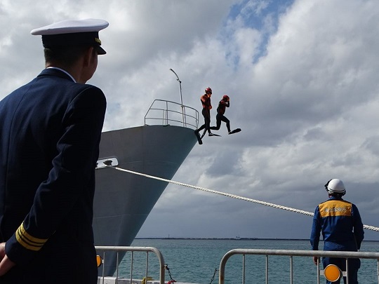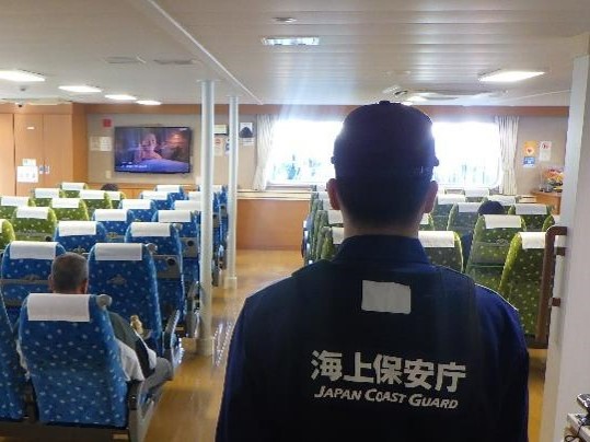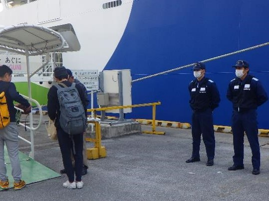 巡視船くだか職員は、12月27日、泊港及び粟国港ターミナル警戒を実施するとともに、離島航路のフェリーに乗船し運航中の船内の監視、警戒に当たりました。出港前は舷門警戒やフェリー船内で不審物等の点検を行い、船員・乗客や港湾関係者にテロ警戒や犯罪の未然防止、安全運航の徹底などを呼びかけました。