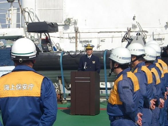 1月6日、泊ふ頭8号岸壁において2026年最初の潜水訓練を実施し、海の安全を守る決意を新たにしました。訓練は海上保安部長訓示に始まり、くだか船長から気迫のこもった「訓練かかれ」の号令により乗組員一同気を引き締めて配置につきました。潜水士は新年の抱負とともに船首飛込みを行い、ドルフィン、船首登はん、錘運搬、要救助者搬送の5種目の訓練を行いました。