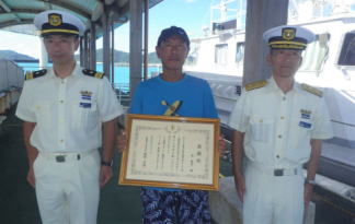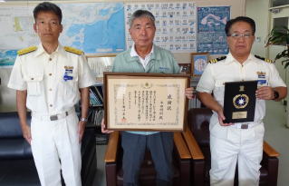 海上防犯活動や海洋環境保全の啓発等をボランティアとして活動している「海上保安協力員」の皆様と日々連携、協力して海上保安業務に当たっています。この度、長年にわたり協力員として活動し、海上保安業務に貢献していただいている座間味ダイビング協会理事の岸敦史氏に対しまして、那覇海上保安部長から謝意をお伝えするとともに感謝状を贈呈しました。