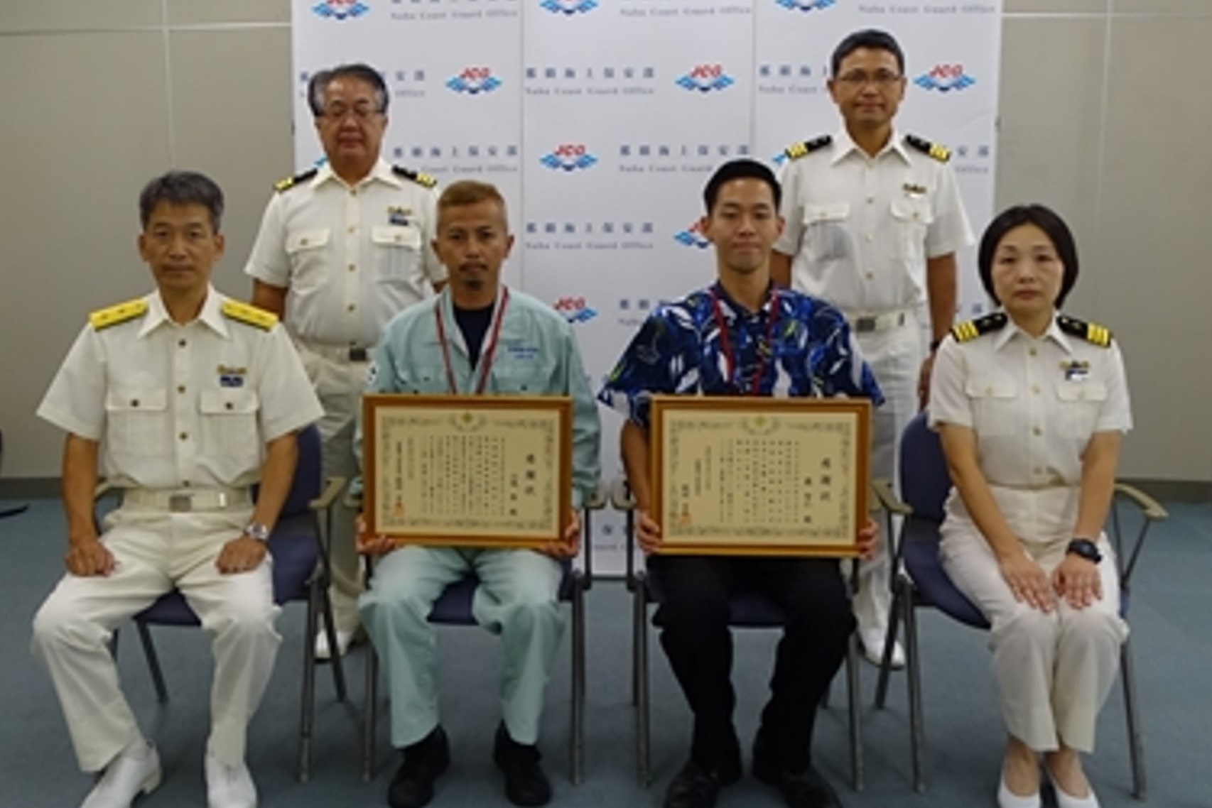 10月10日、薮智仁氏は読谷村都屋ビーチにて溺れていた40代の韓国籍男性を救助しました。また、10月25日、山城隼氏は糸満漁港沖で航行不能となった6人(大人2人、子供4人)が乗船していた船舶を曳航救助しました。その貢献に対し那覇海上保安部長から感謝状を贈呈するとともに謝意をお伝えしました。