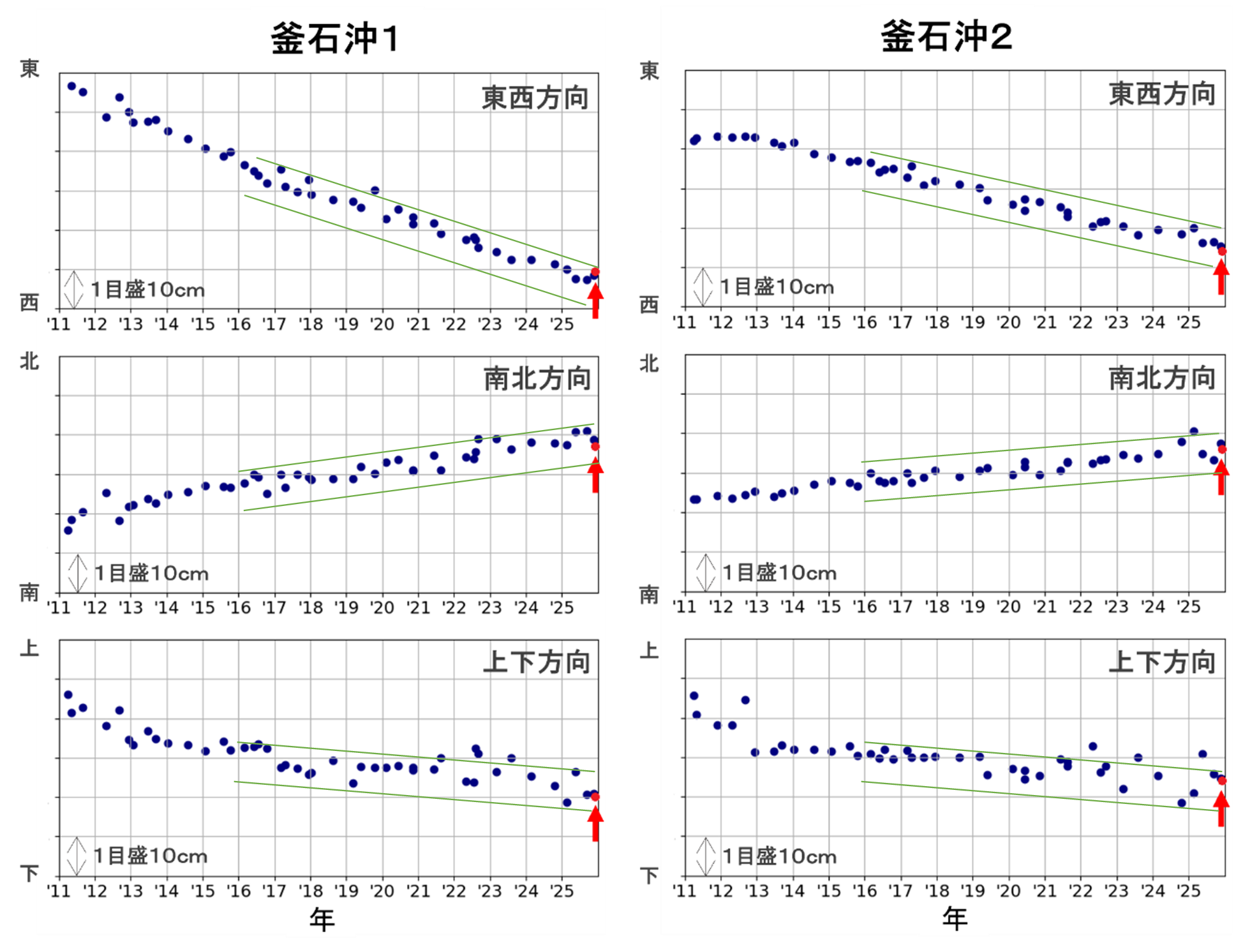 観測の結果、「釜石沖1」及び「釜石沖2」観測点において、今回の地震に伴う顕著な地殻変動は検出されませんでした(図3)。